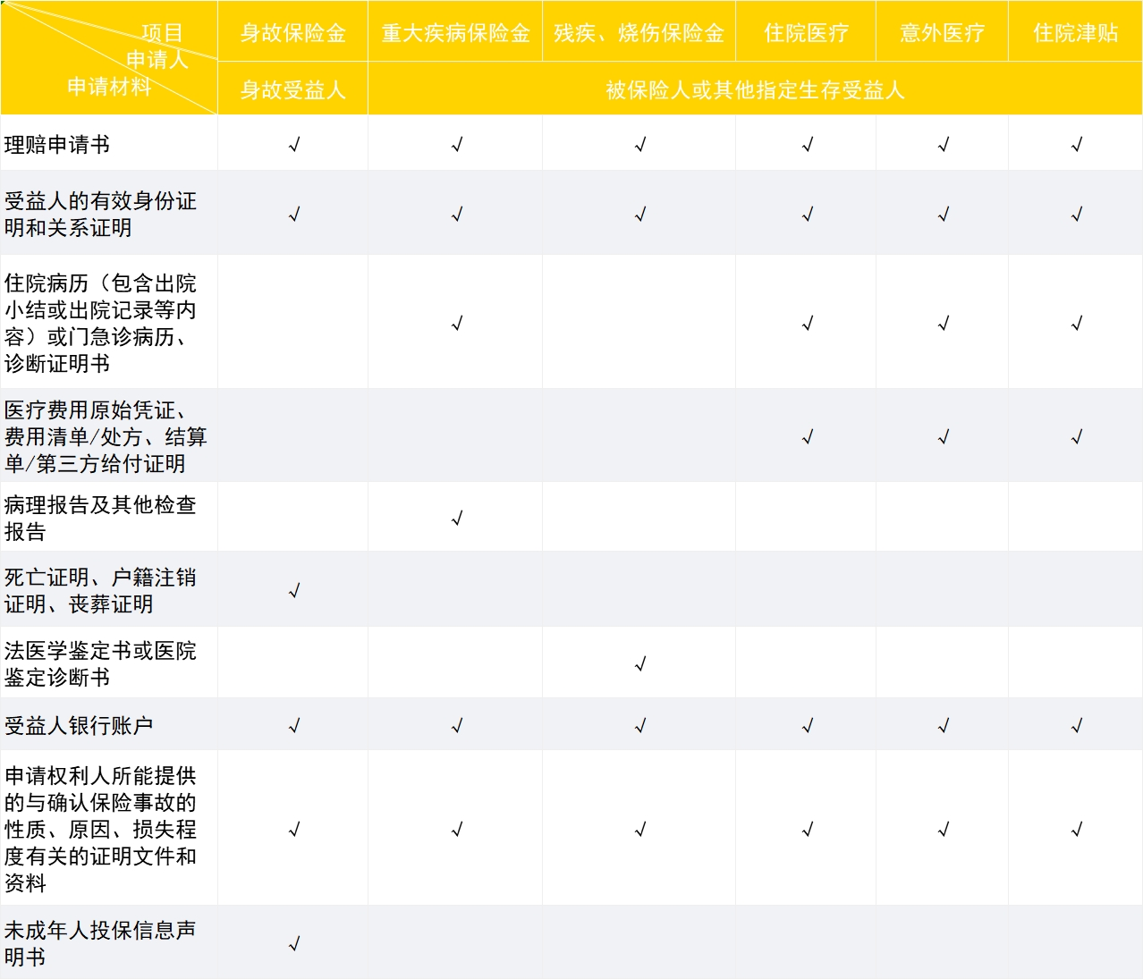 理赔所需资料一览表